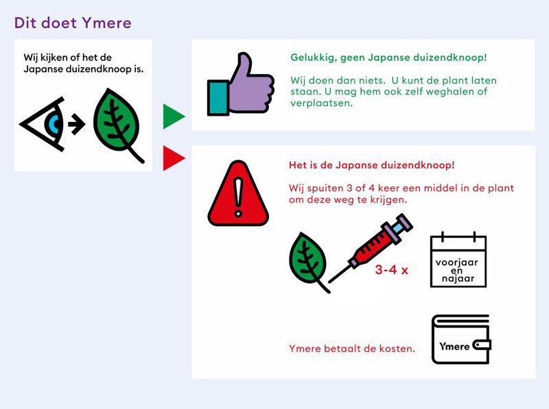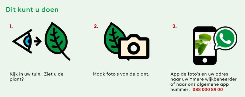 Ziet u deze plant? Meld het dan bij ons via MijnYmere. U kunt ons ook bellen op 088 000 89 00 of stuur een Whatsapp-bericht naar 06 13 22 12 20. Wij komen de plant dan weghalen. Dit is heel lastig en kan lang duren, maar het kost u niets.