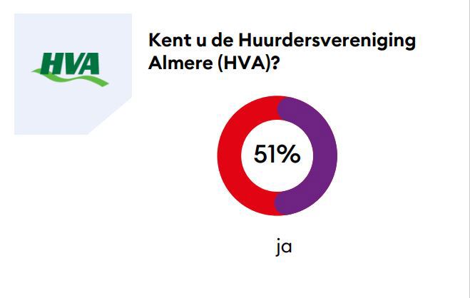 De helft (51%) van de deelnemers die in Almere wonen, kende voor dit onderzoek de Huurdersvereniging Almere (HVA). Deelnemers jonger dan 35 jaar zijn minder vaak bekend met HVA dan deelnemers van 35 jaar en ouder.