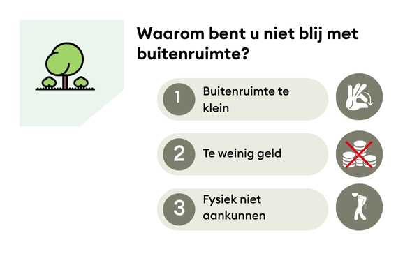 Andere redenen die deelnemers geven zijn een tekort aan ruimte in de buitenruimte en tevredenheid met hoe groen de buitenruimte al is.