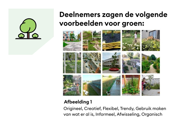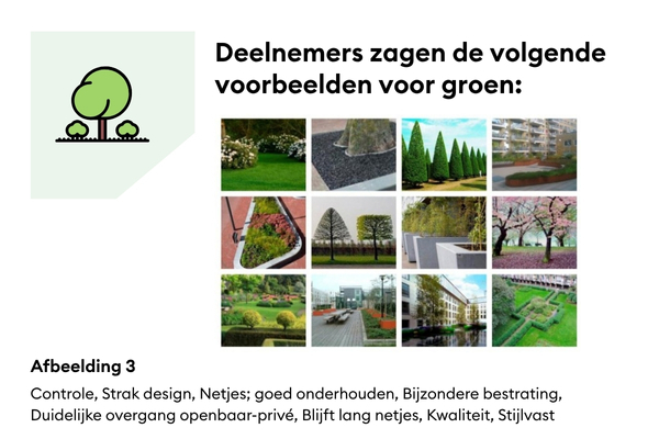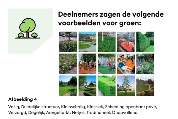Deelnemers hebben de volgende afbeeldingen te zien gekregen als voorbeelden voor groen in de directe omgeving.