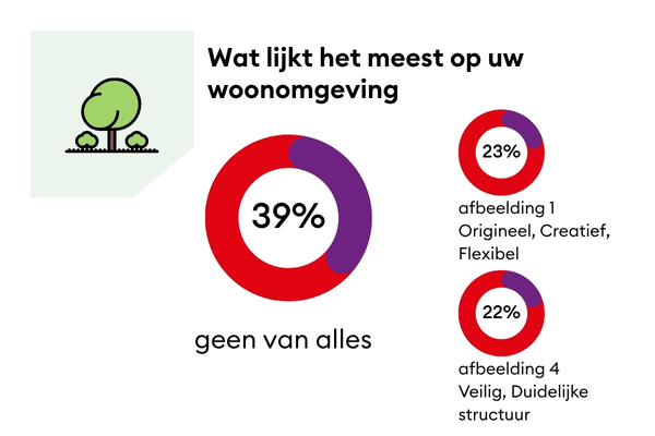 Een kwart (25%) van de deelnemers zou willen dat het groen in de directe omgeving eruitziet als op afbeelding 4. Twee op de tien deelnemers zou willen dat het groen eruitziet als afbeelding 2 (22%) of afbeelding 1 (19%). Eén op de acht (13%) deelnemers is tevreden met het groen in de directe omgeving.