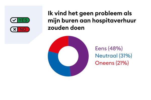 Bijna de helft (48%) van de deelnemers zou het geen probleem vinden als hun buren aan hospitaverhuur zouden doen. Eén op vijf (21%) deelnemers zou het wel een probleem vinden.