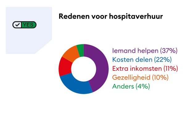 Bijna vier op de tien (37%) deelnemers zou aan hospitaverhuur doen om iemand aan een woonruimte te helpen. Voor één op de vijf (22%) deelnemers zou het delen van kosten de belangrijkste reden zijn om aan hospitaverhuur te doen.