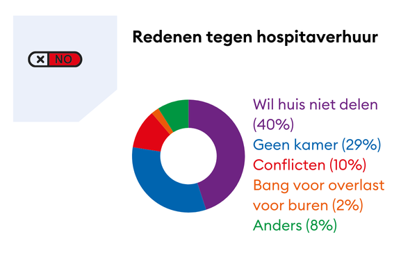 Vier op de tien (40%) deelnemers zou hun huis niet willen delen met een ander. Drie op de tien (29%) deelnemers zou niet aan hospitaverhuur doen, omdat zijn geen kamer over hebben.