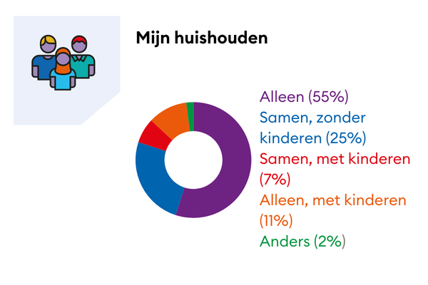 Ruim de helft (55%) van de deelnemers woont alleen. Een kwart (25%) woont met één andere volwassene samen, zonder kinderen. Bijna één op de vijf (18%) deelnemers heeft een huishouden met kinderen.