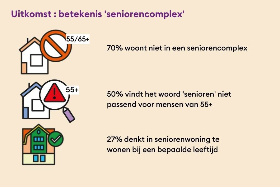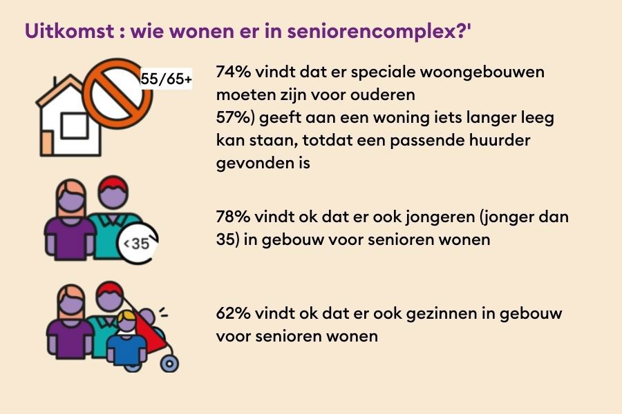 Het merendeel van de ondervraagden vindt dat er speciale woongebouwen moeten zijn voor ouderen (74%). Ook vindt een meerderheid het niet erg dat er ook jongeren/gezinnen in een seniorencomplex wonen (62%). Hoe jonger men is (34 en jonger zelfs 78%), hoe minder problemen zij hier mee hebben.