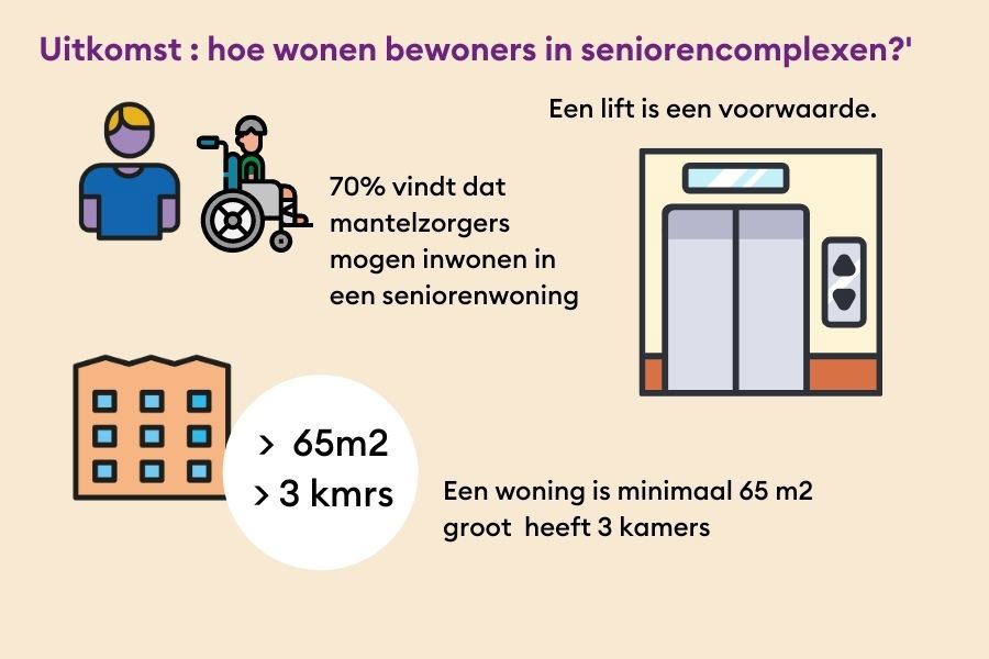 We vroegen de panelleden ook naar hun woonwensen. Een duidelijke meerderheid vindt dat er een mogelijkheid moet zijn om mantelzorgers te laten inwonen in een seniorenwoning (70%). Het panel vindt ook dat over het algemeen dat een woning minimaal 65 m2 groot zou moeten zijn voor senioren en het liefst drie kamers moet hebben. Een lift is overigens ook een voorwaarde.