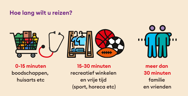 - U wilt het verst reizen voor familie, vrienden en kennissen. Voor winkels voor dagelijkse boodschappen en de huisarts/fysiotherapeut wilt u maximaal 15 minuten reizen.