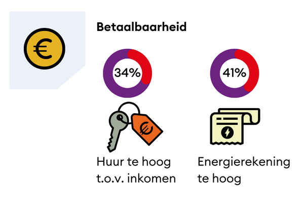 Een derde van de huurders vindt de huur te hoog voor hun inkomen. Nog eens een derde vindt de huur hoog, maar nog wel betaalbaar. Bijna niemand vindt zijn huur (te) laag. De energierekening drukt nog vaker op het inkomen: vier van de tien huurders geven aan dat de energierekening te hoog is voor hun inkomen.