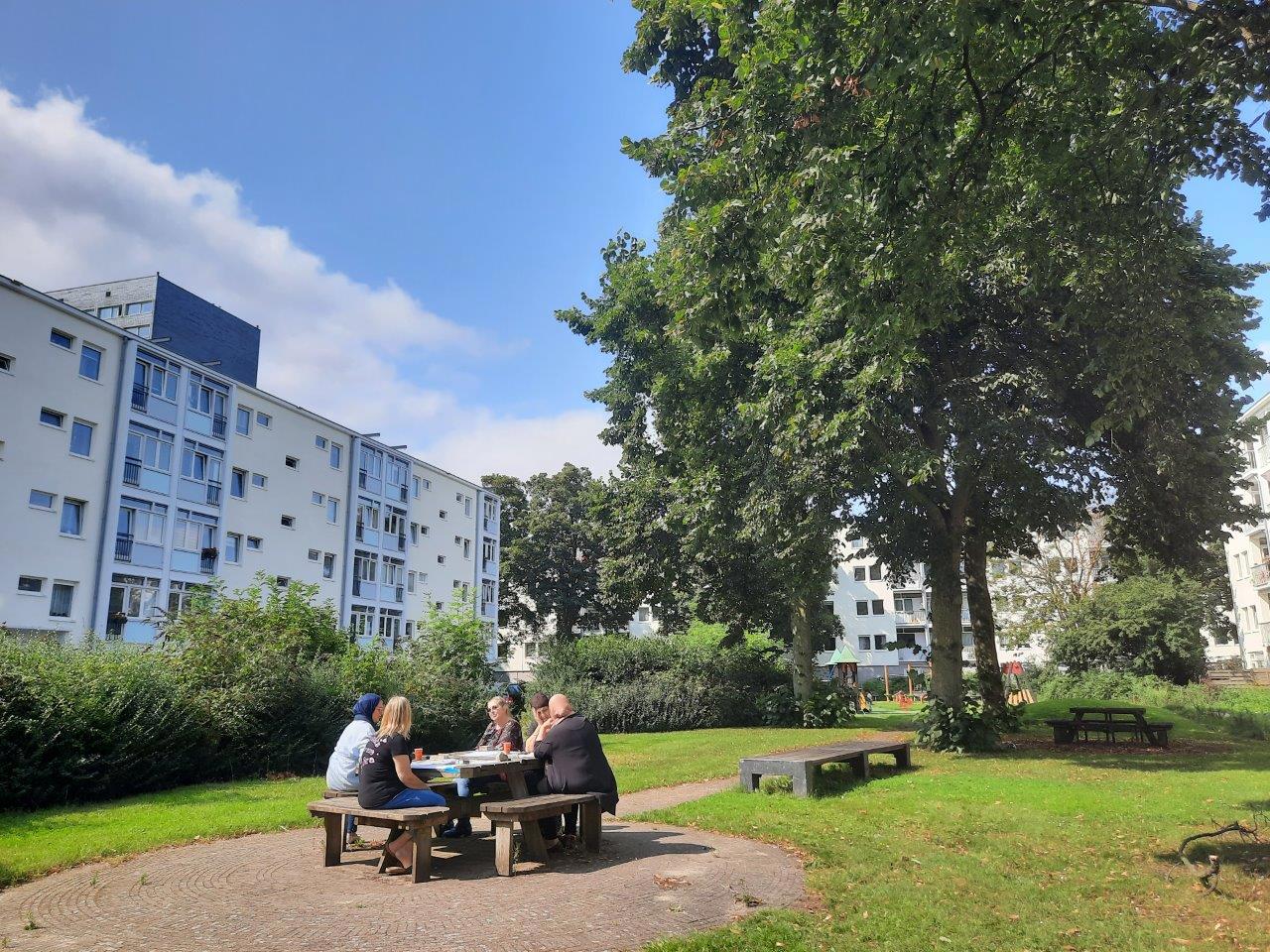 De binnentuin van de metselwerkblokken was als eerste klaar. Nu zijn de tuinen bij de stucwerkblokken aan de beurt. Qua timing was het een mooi moment om de bewoners uit te nodigen voor een bezoekje aan de Ymere Ontmoetbus om te horen welke wensen zij hebben voor de herinrichting.