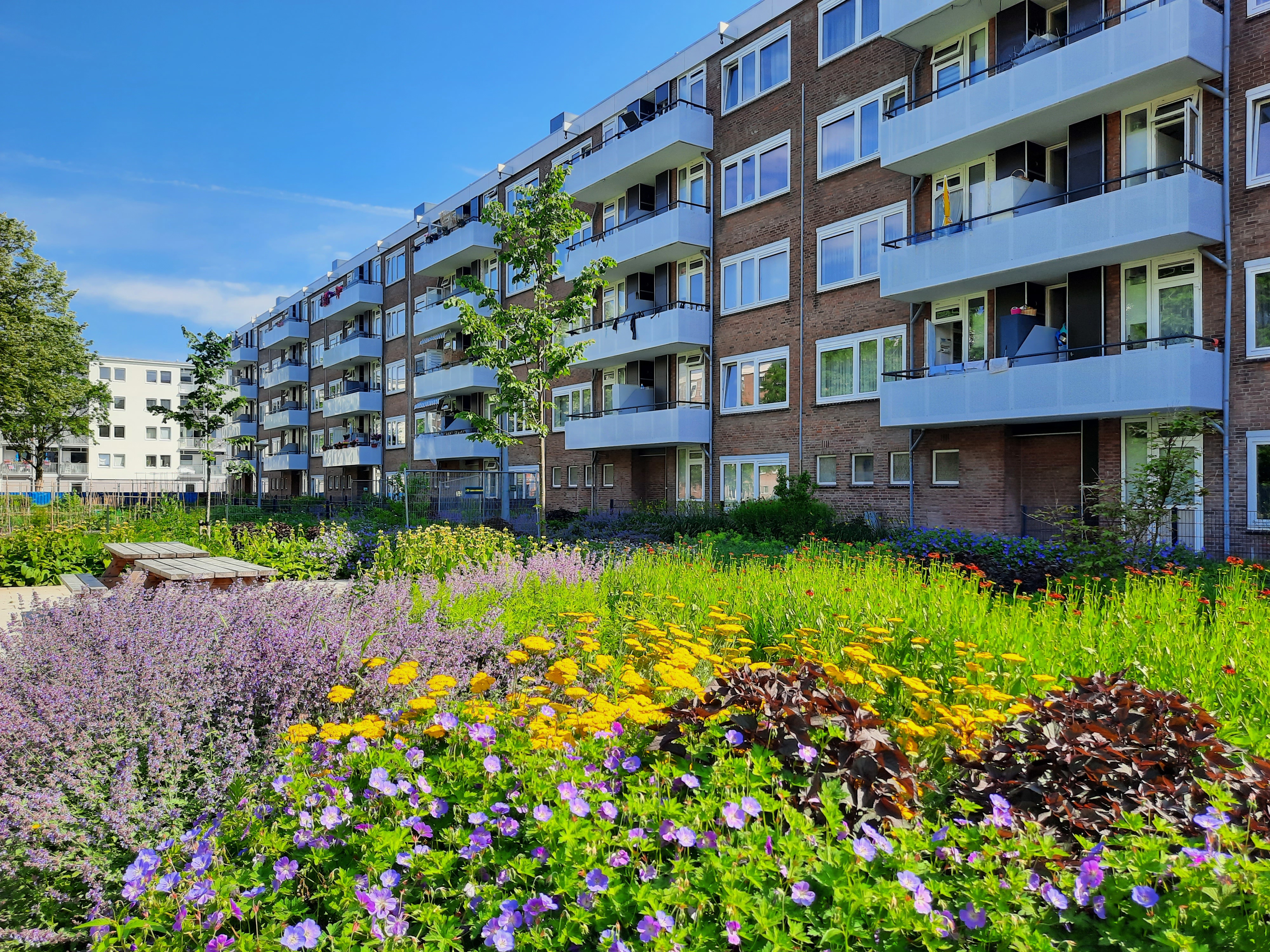 De Reimerswaalbuurt in Amsterdam West is gerenoveerd. De woonblokken waren verouderd en ook niet meer duurzaam. Het groenteam werkte ondertussen ook aan plannen om de omgeving van de gerenoveerde blokken weer mooi en duurzaam te maken. De herinrichting is nu groener dan ooit. En dat is niet alleen mooier, maar ook fijner voor het leefklimaat in de stad.
