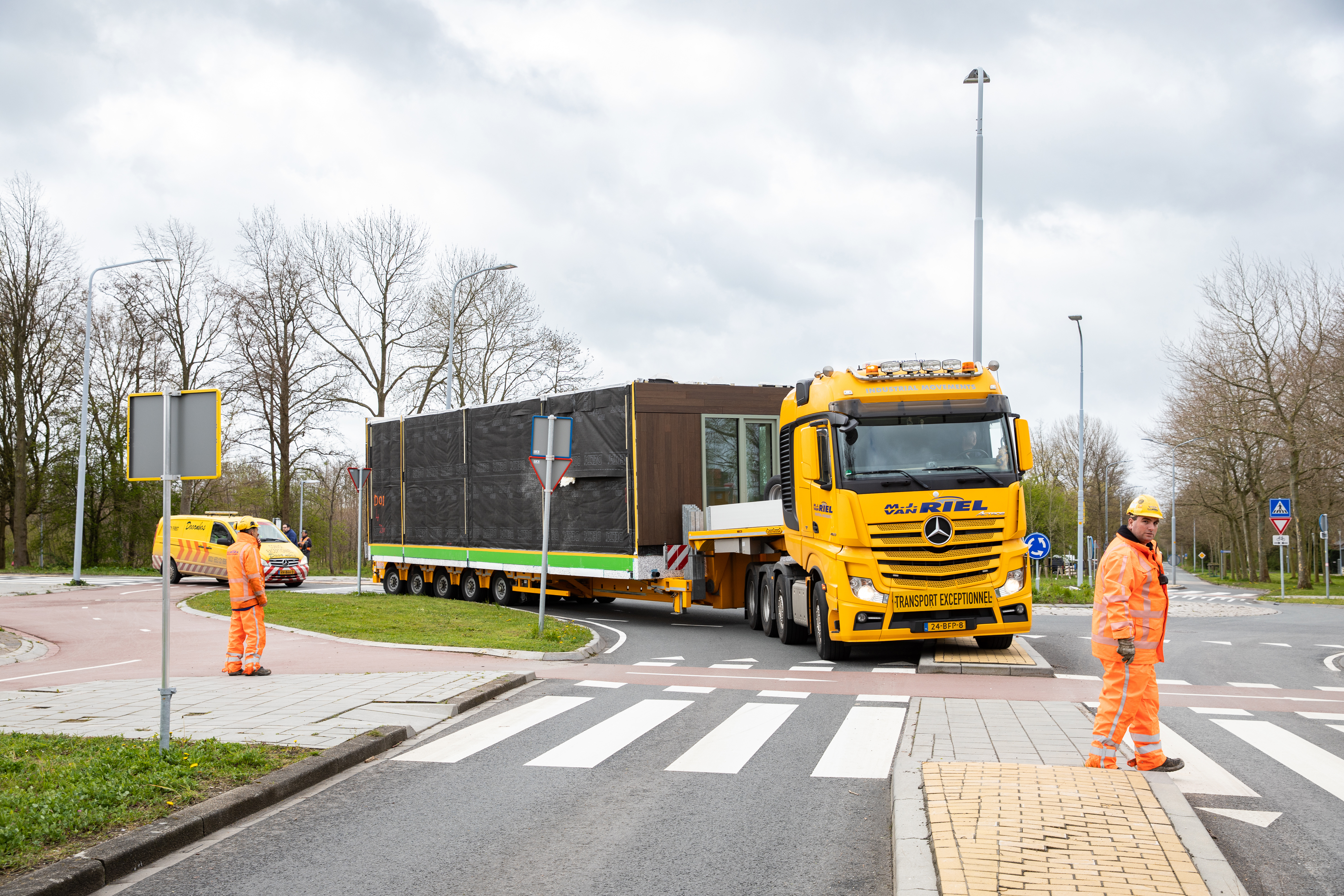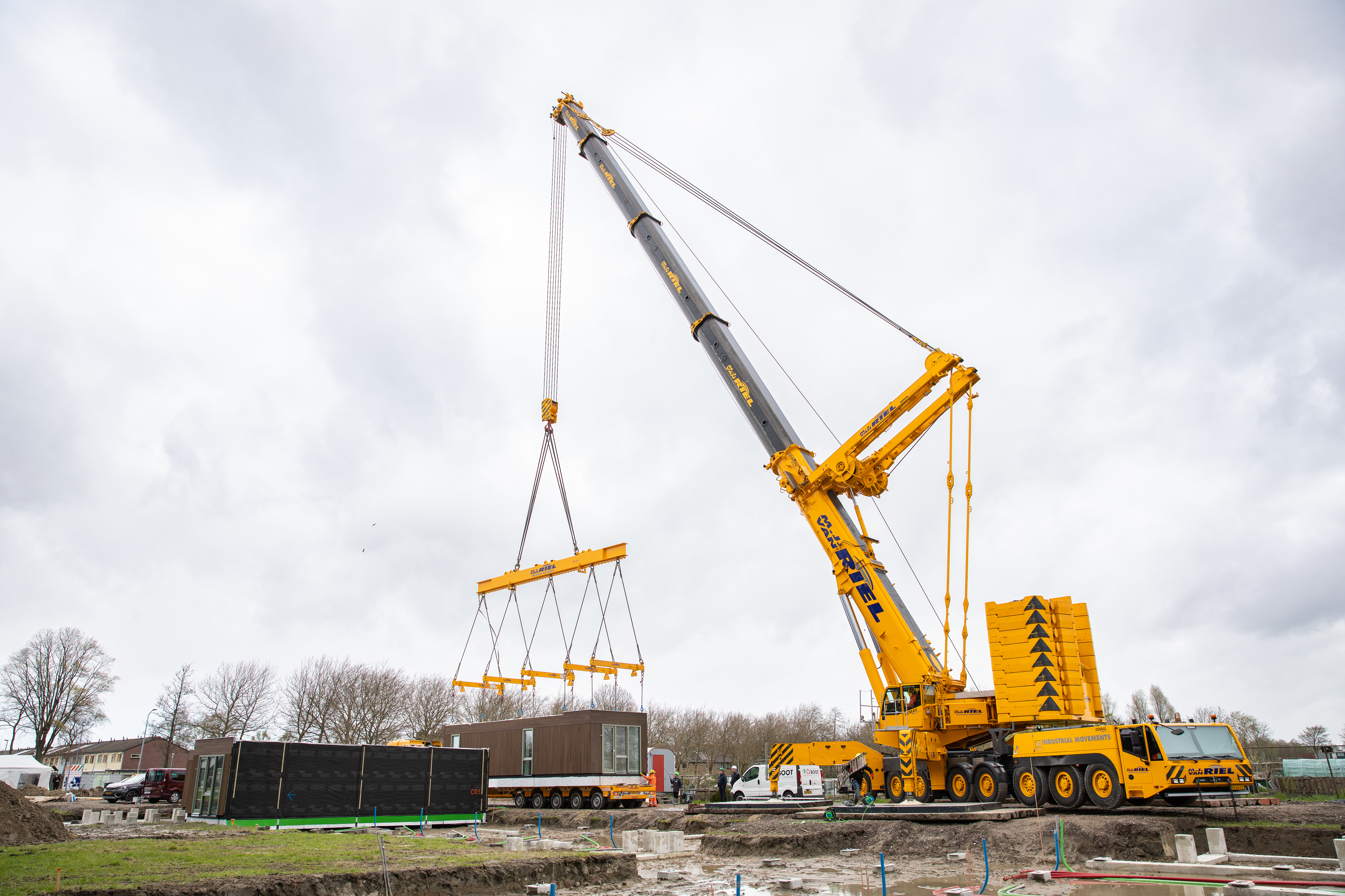 Een rotonde, en nog een rotonde, even een lantaarnpaal ontwijken en een voorrangsbord en dan stuurt de chauffeur van de dieplader met uiterste precisie achteruit de bouwplaats op. Alsof het een pakketbezorger is. Alleen is het pakket waarmee hij Erik Gerritsen, voorzitter van de directieraad van Ymere, vandaag verblijdt, flink wat groter én zwaarder.