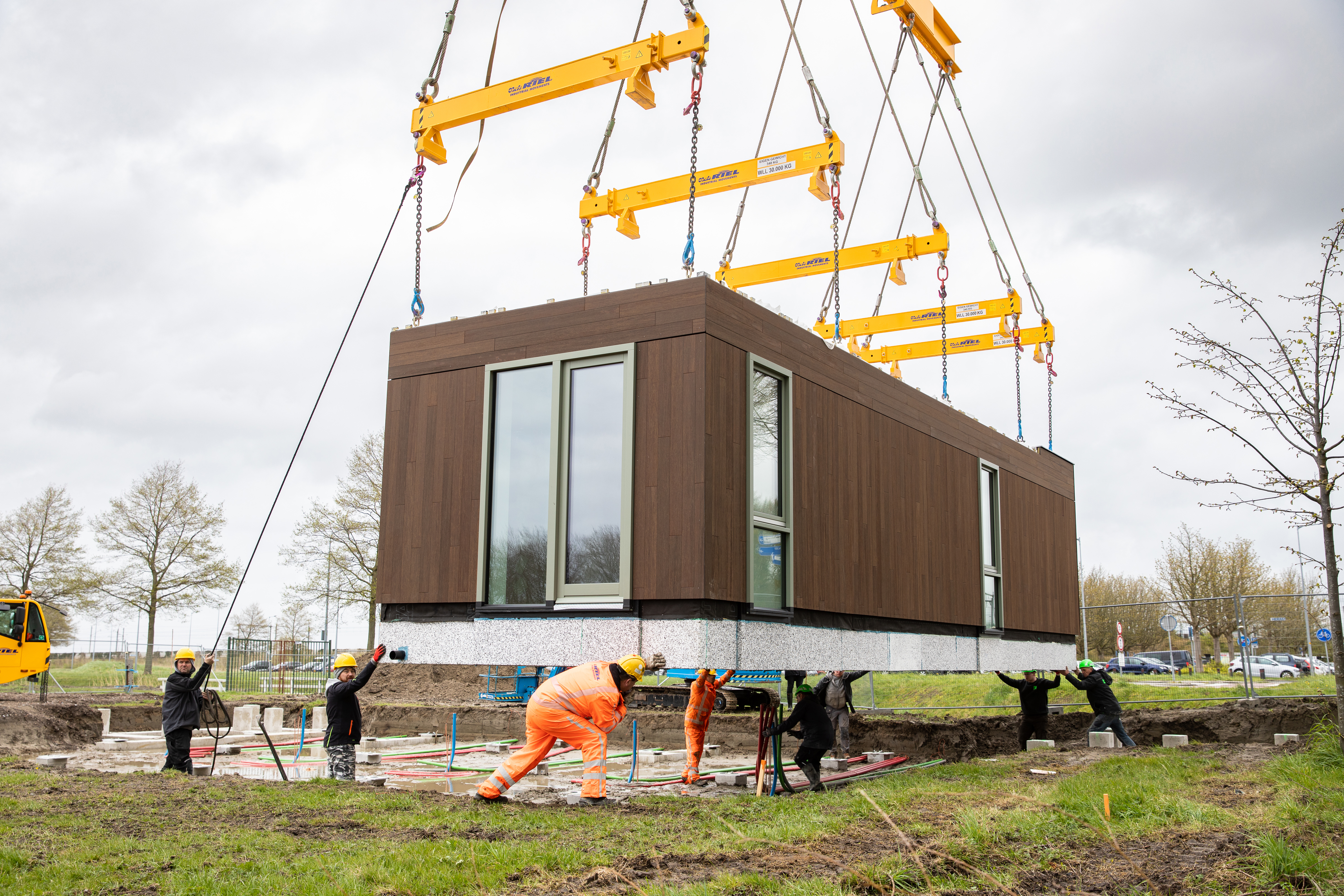 Amper vier weken na het slaan van de eerste paal, zijn vandaag de eerste 8 van in totaal 60 circulaire flexwoningen bij het station in Nieuw-Vennep met een grote kraan op hun plek gehesen. In het nieuwe wijkje komen 60 woningen voor onder andere (her)starters die nu grote moeite hebben een woning te vinden. De nieuwe sociale huurwoningen zijn één van de oplossingen voor de wooncrisis.