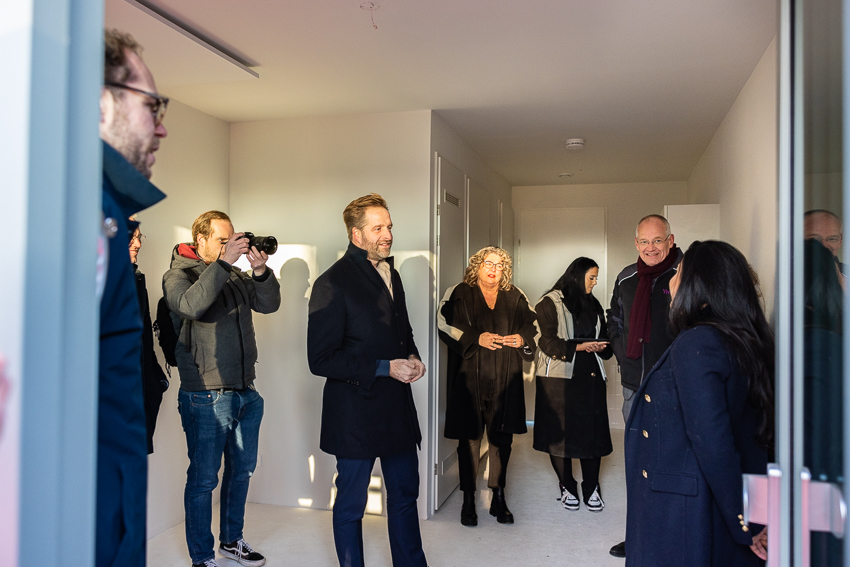Minister De Jonge was onder de indruk van de kwaliteit, architectuur en vooral de persoonlijke verhalen die hij hoorde van de nieuwe bewoners. Zo bekeek hij de nieuwe woning van Celine wiens vader het stiekem toch jammer vindt dat z'n dochter nu een eigen huissleutel heeft. “Eigenlijk ben ik je eerste bezoek. Wat een eer voor mij!”, zei De Jonge lachend terwijl hij een rondleiding kreeg. Ook hielp hij Celine alvast met de inrichting: “Ik zou hier lekker de bank neerzetten, dan zit je lekker warm onder je infrarood paneel.”