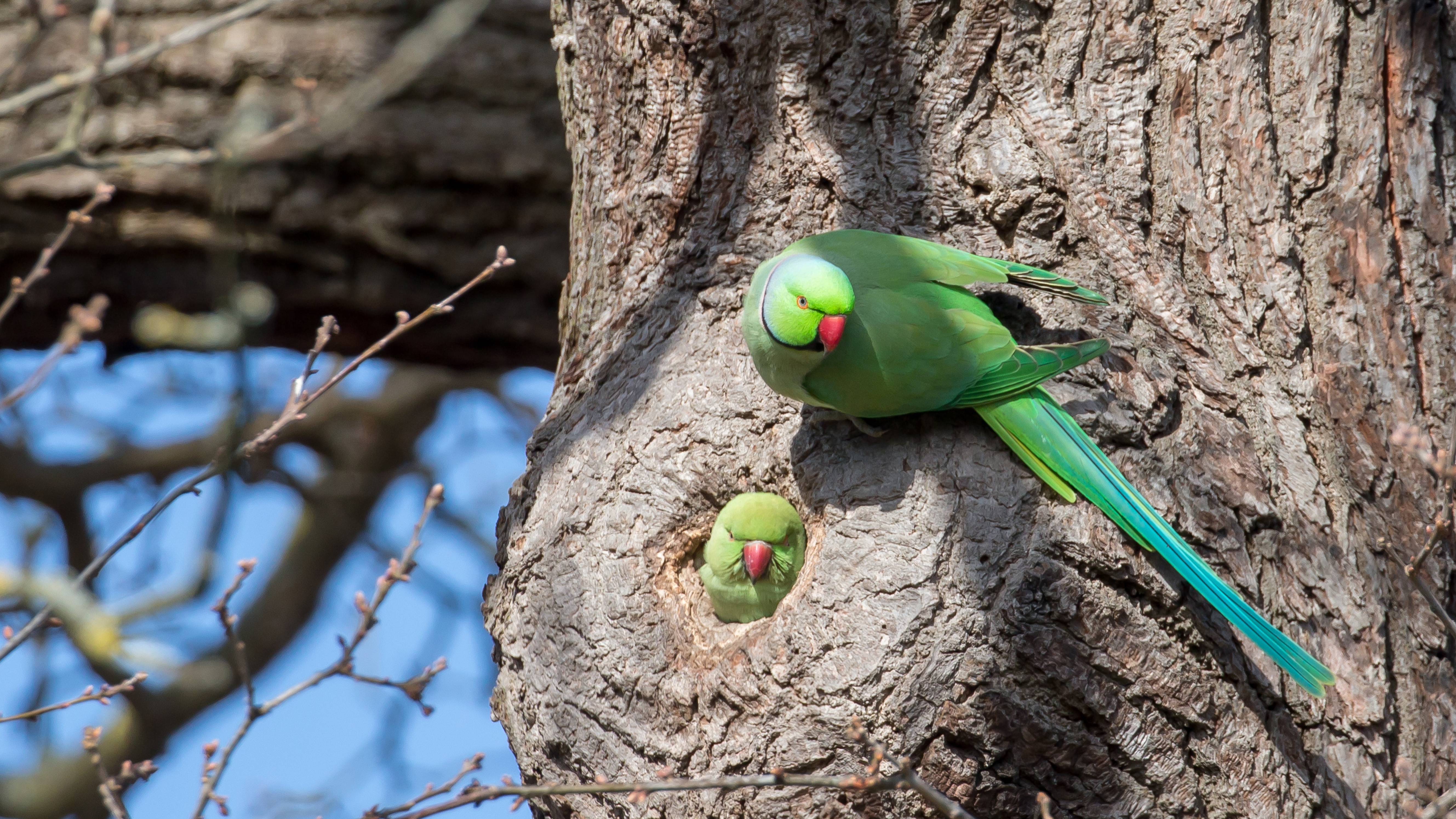 Halsbandparkieten zijn vogels die oorspronkelijk niet in Nederland voorkomen, maar zich er wel uitstekend thuis voelen. Vrijgelaten of uit hun kooien ontsnapt –daarover verschillen de meningen-, vestigden ze zich definitief in Amsterdam, Den Haag, Utrecht en andere delen van de Randstad. De brutale dieren, die zich vaak verplaatsen in grote groepen, maken een oorverdovend lawaai bij gevaar.