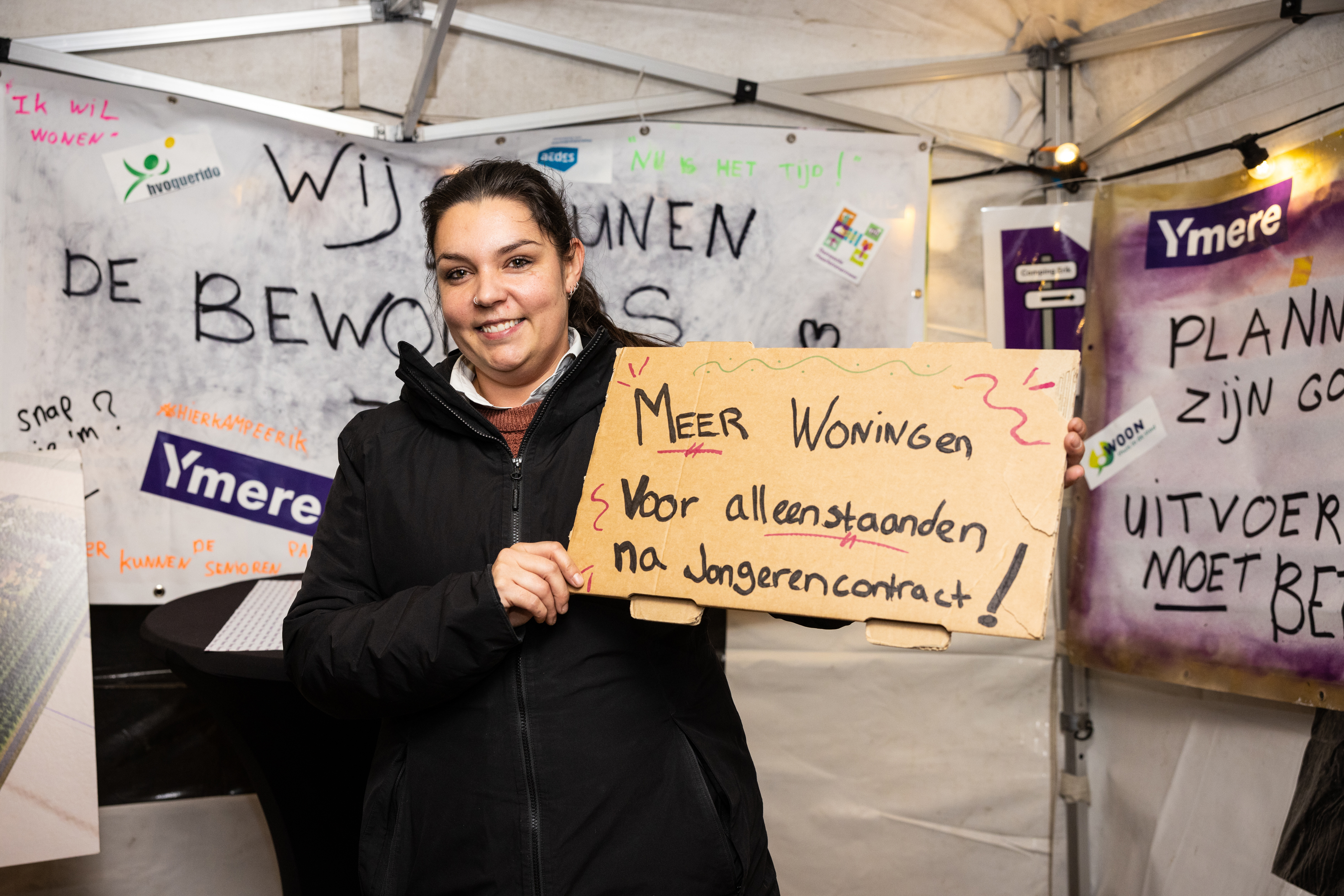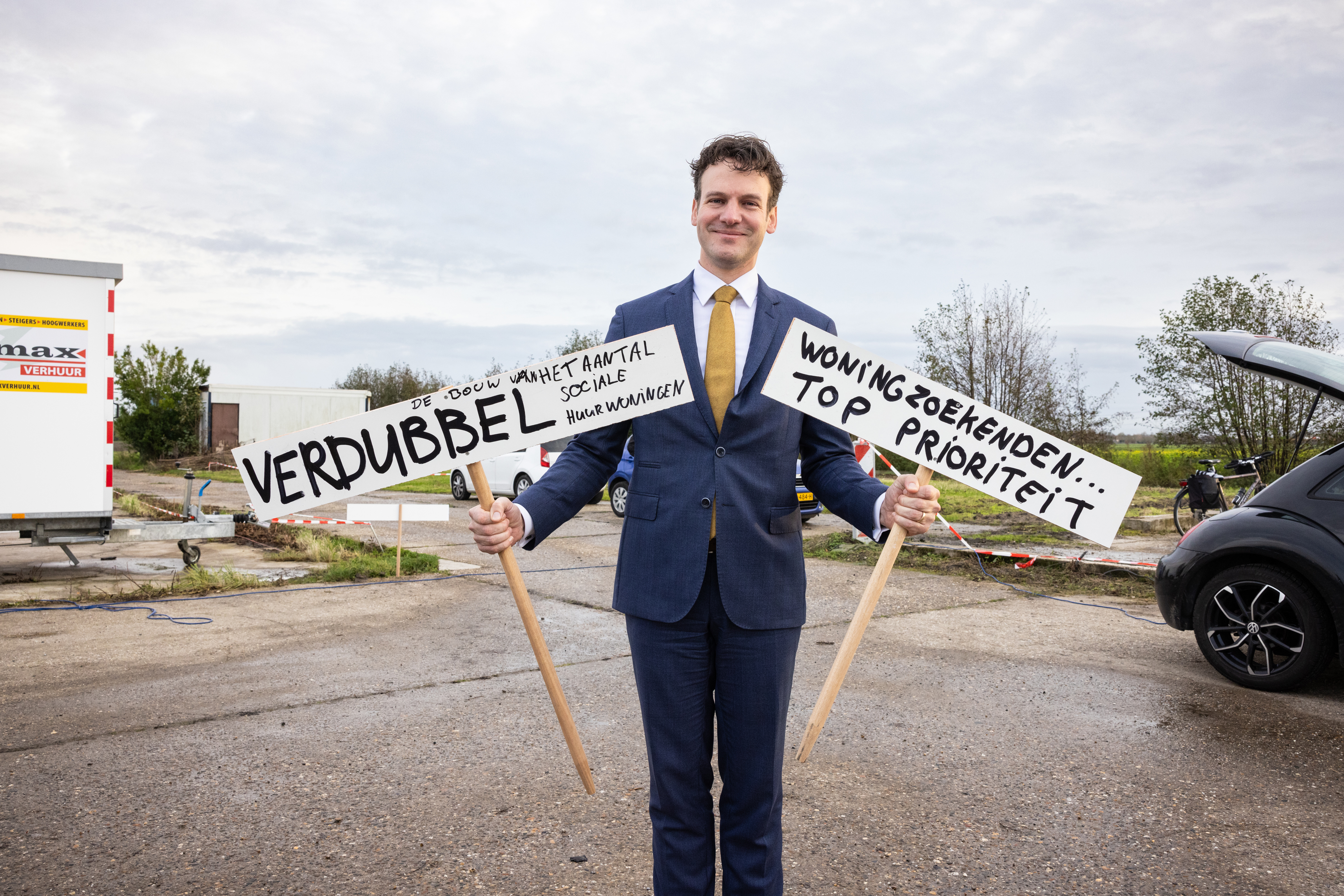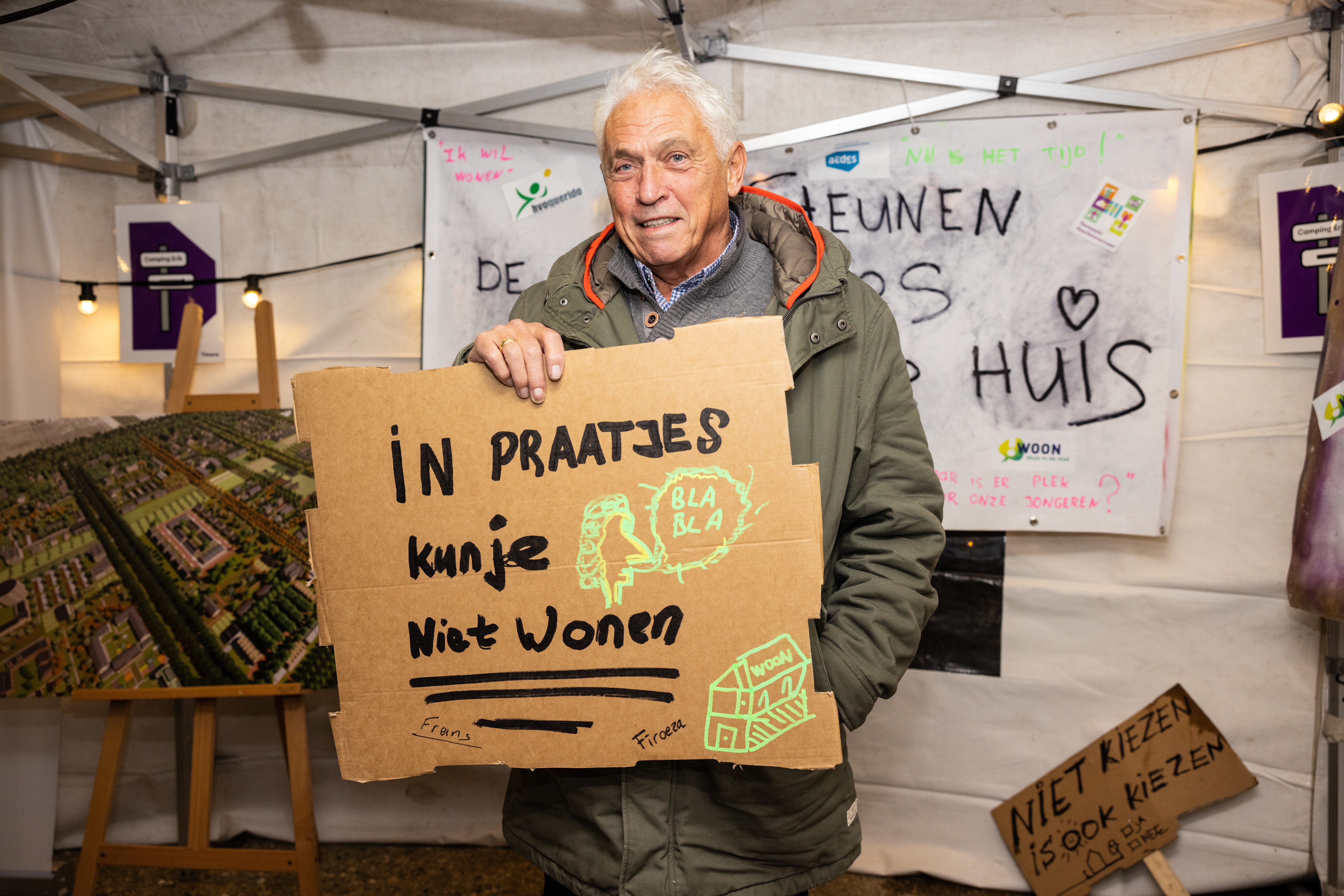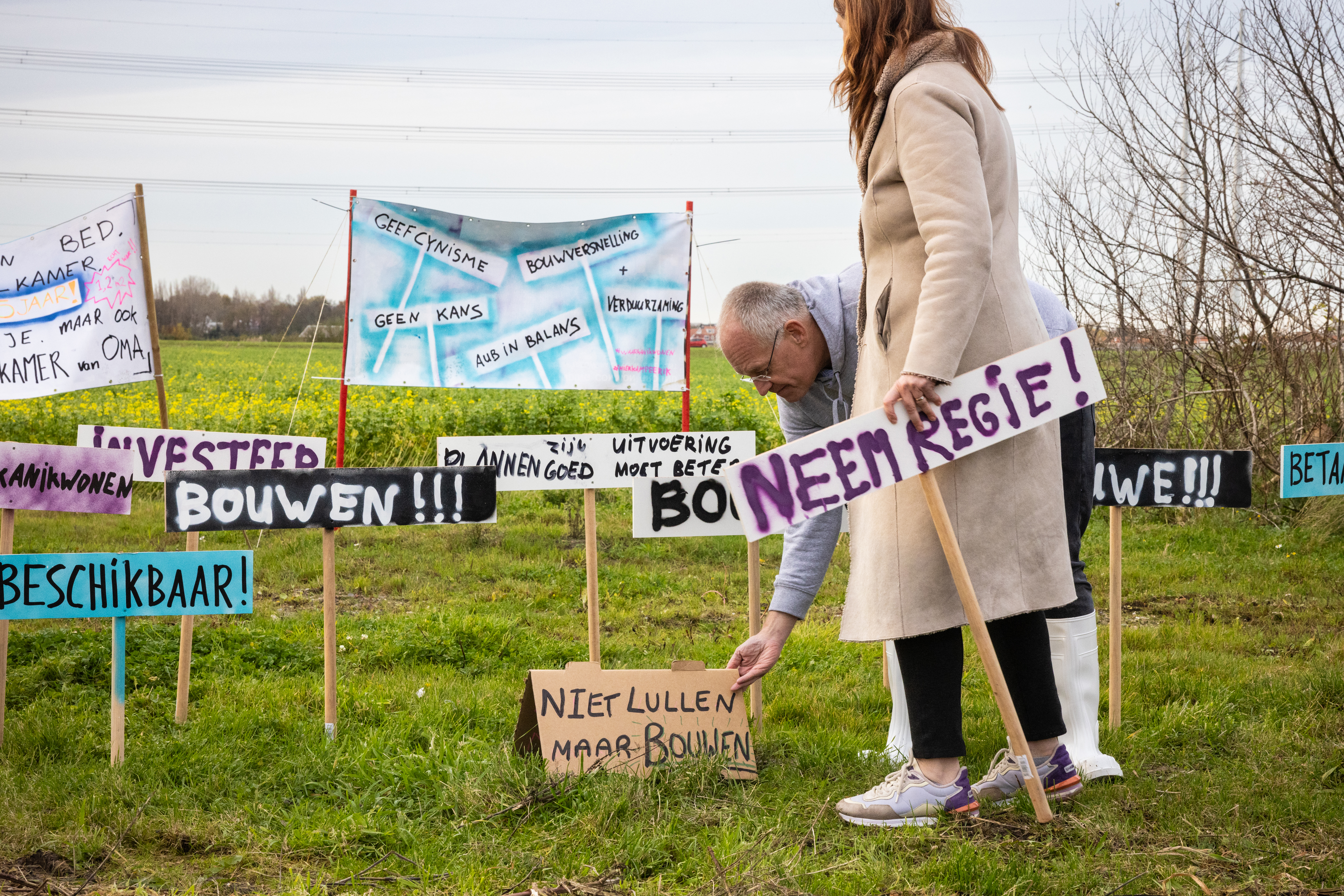 “We staan hier om al die honderdduizenden woningzoekenden een stem te geven. Hun verhalen te laten horen. En om aandacht te vragen voor het grote tekort aan betaalbare woningen. Van sociale-, midden- en -vrije sectorhuurwoningen, tot koopwoningen voor ieder budget. Als we ergens kunnen bouwen is het hier”, zegt Gerritsen met op de achtergrond nu nog akkers zover het oog reikt. “De grond is al van ons en onze partners, de ideeën liggen klaar, we kunnen aan de slag. En als we dat samen doen, gaat het nog veel sneller.”