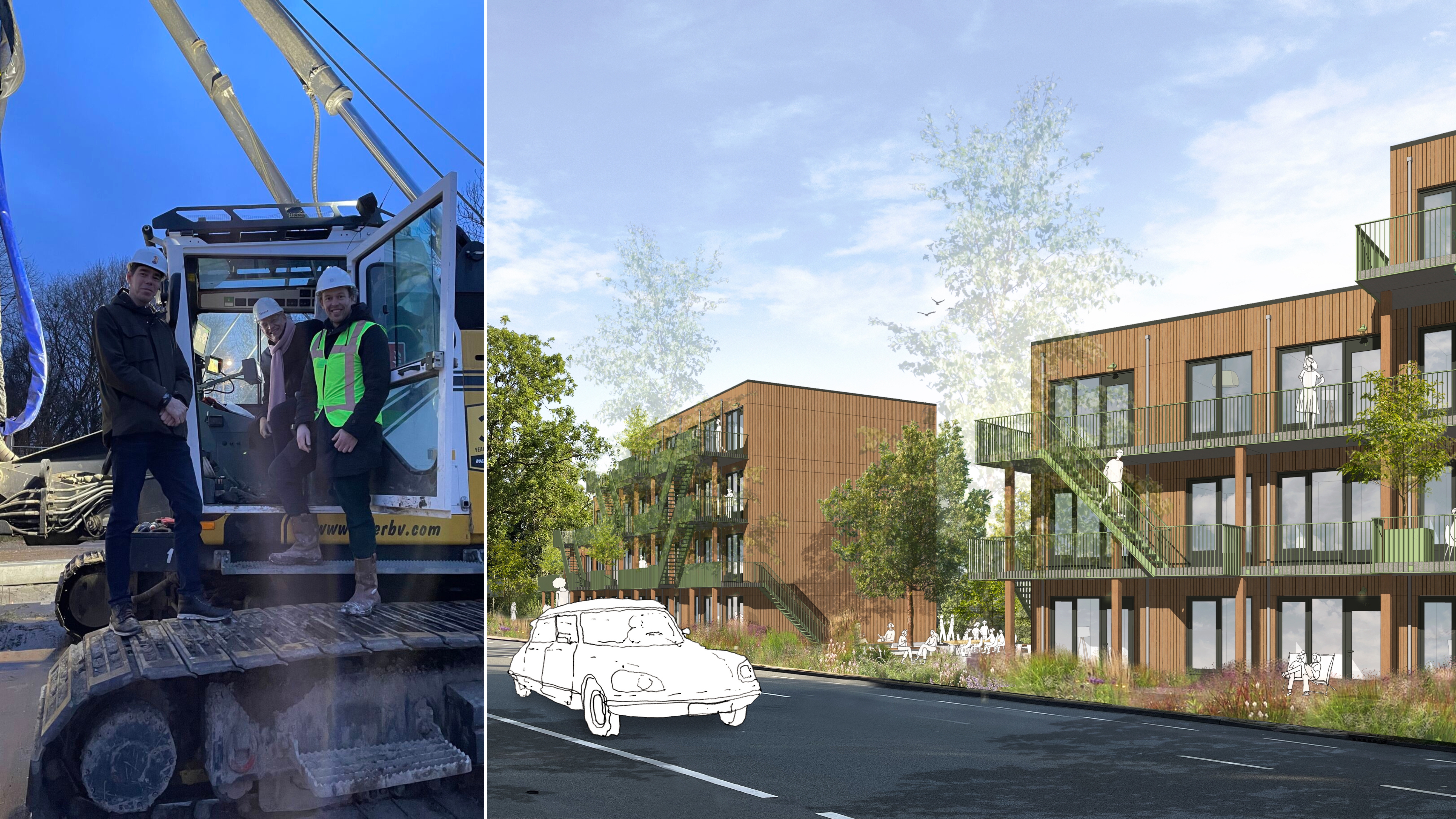 Op de foto: Van links naar rechts: Projectmanager van Ymere Klaas Nieuwenhuisen slaat samen Directievoorzitter Erik Gerritsen van Ymere en Joost Hoffman, co-founder en directeur van Moos, de eerste paal. En rechts een impressie van het eindresultaat vanaf de straatzijde.
