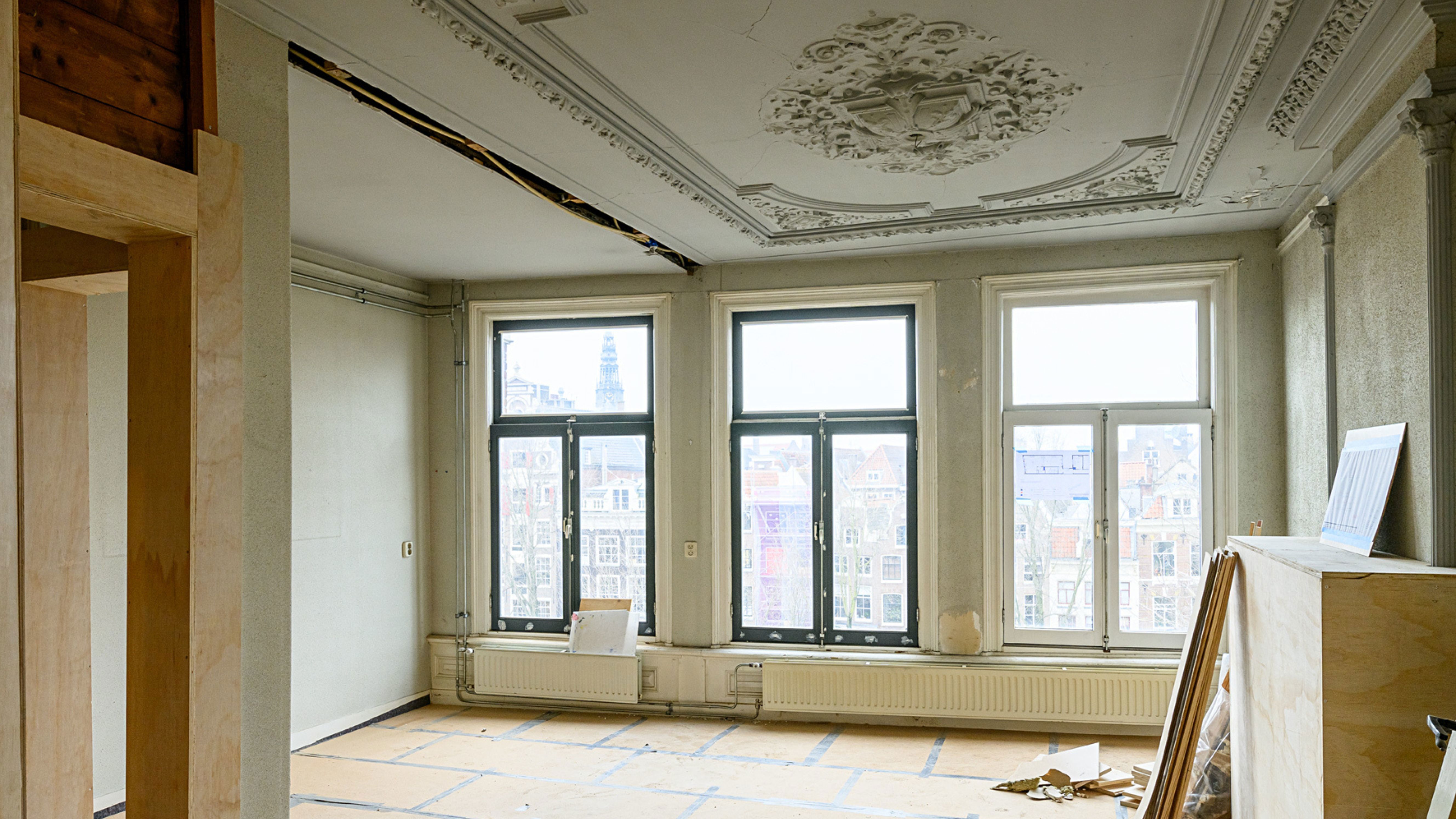De twee statige panden dateren uit de zestiende eeuw en kennen een roerige geschiedenis. Er heeft een brand gewoed, waarna in de negentiende eeuw delen opnieuw werden gebouwd. George Altena van Bouwpartner Coen Hagendoorn was niet verrast toen hij tijdens de stevige klus de meest zeldzame schatten tegenkwam. “Voordat je een muurtje of plafond in zo’n pand weghaalt moet je flink in beraad, maar dan vind je ook wat. En om vacuümglas te plaatsen voor optimale verduurzaming moet je hier uiterst zorgvuldig zijn, waarmee we Monumentenzorg ook erg blij konden maken.”