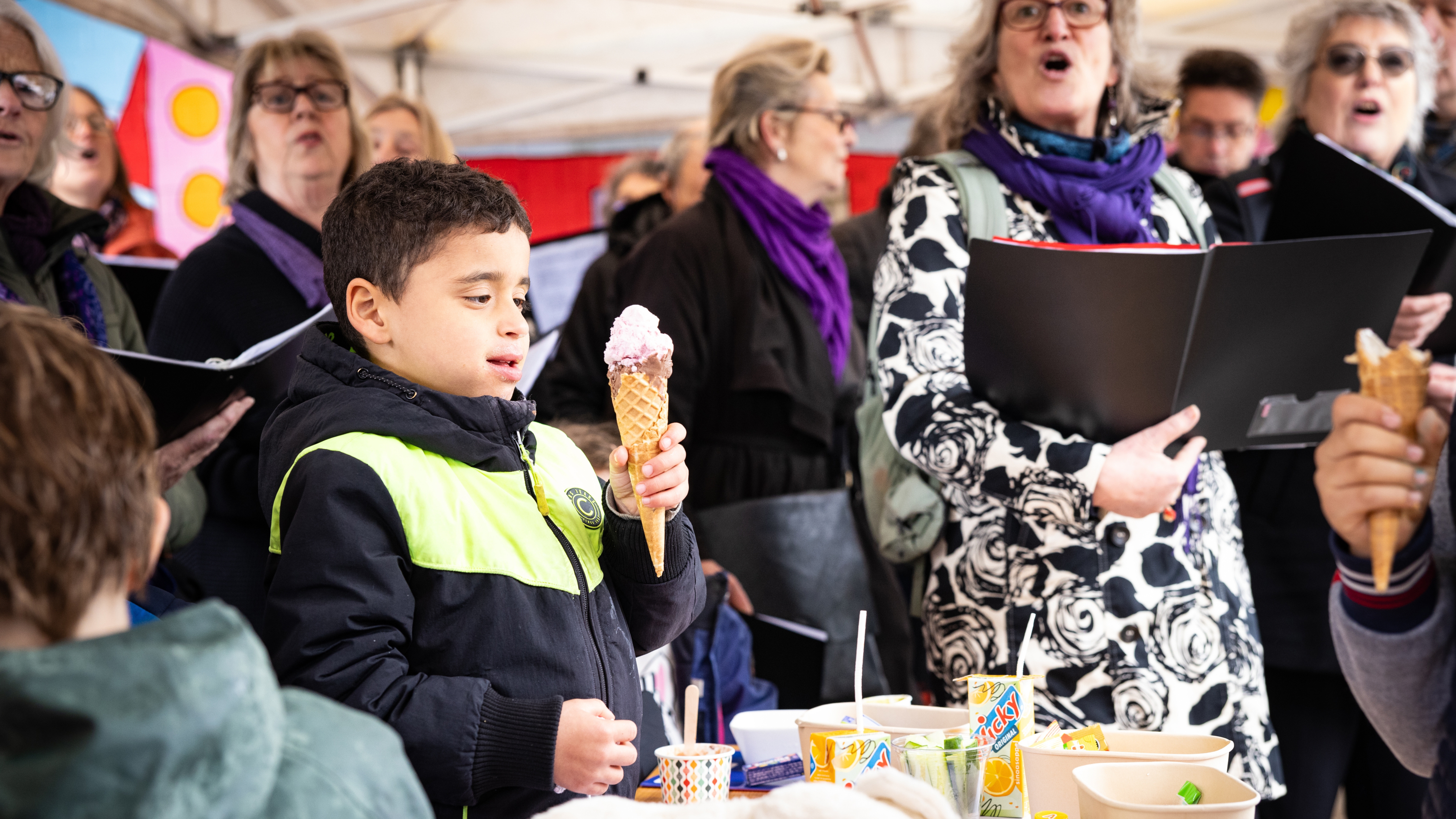 Terwijl het koor De IJgenwijze Noot het publiek trakteerde op gezellige muziek, regende het pijpenstelen. Iedereen vond een schuilplek onder de tenten terwijl het koor voor een goede sfeer zorgde.