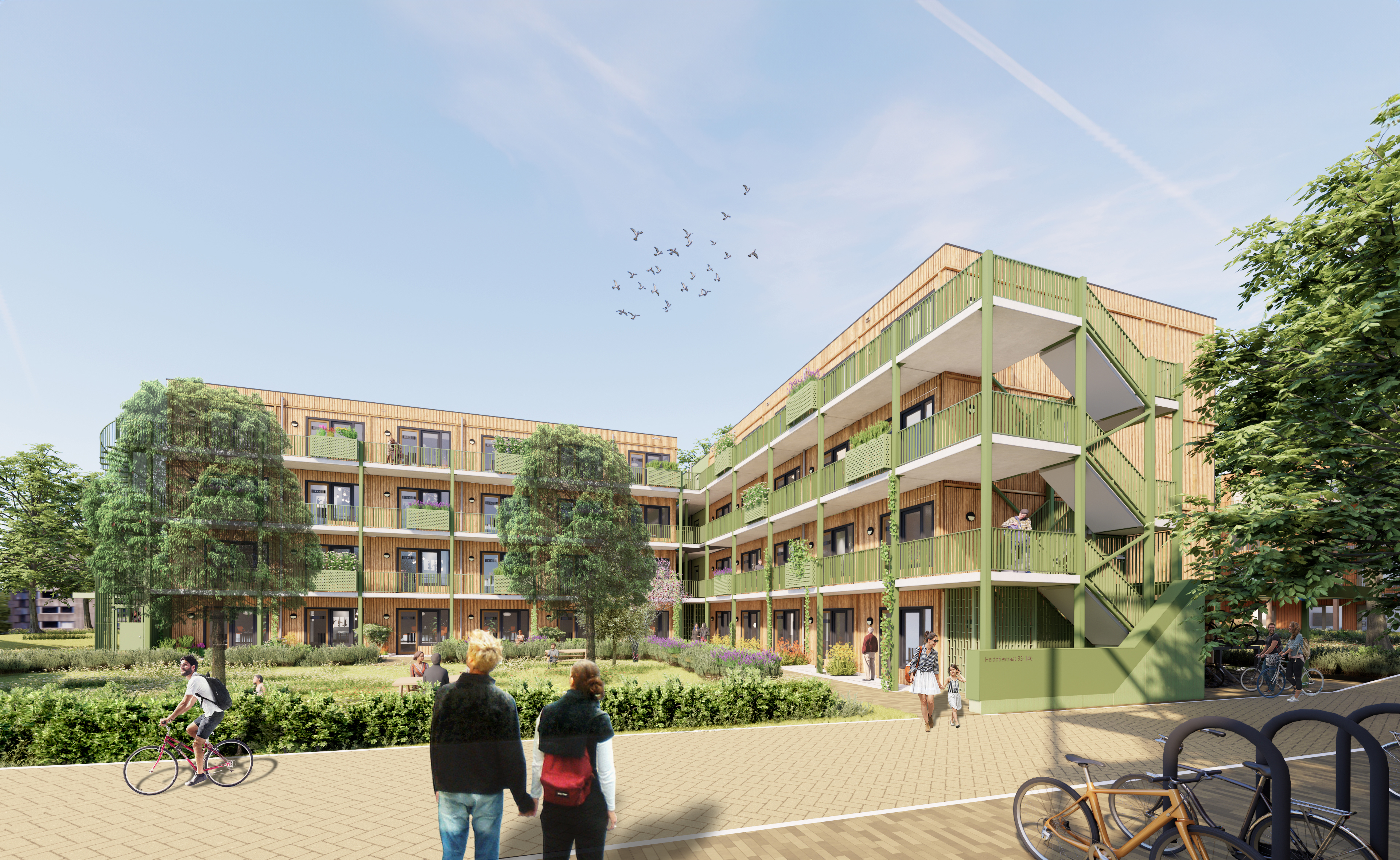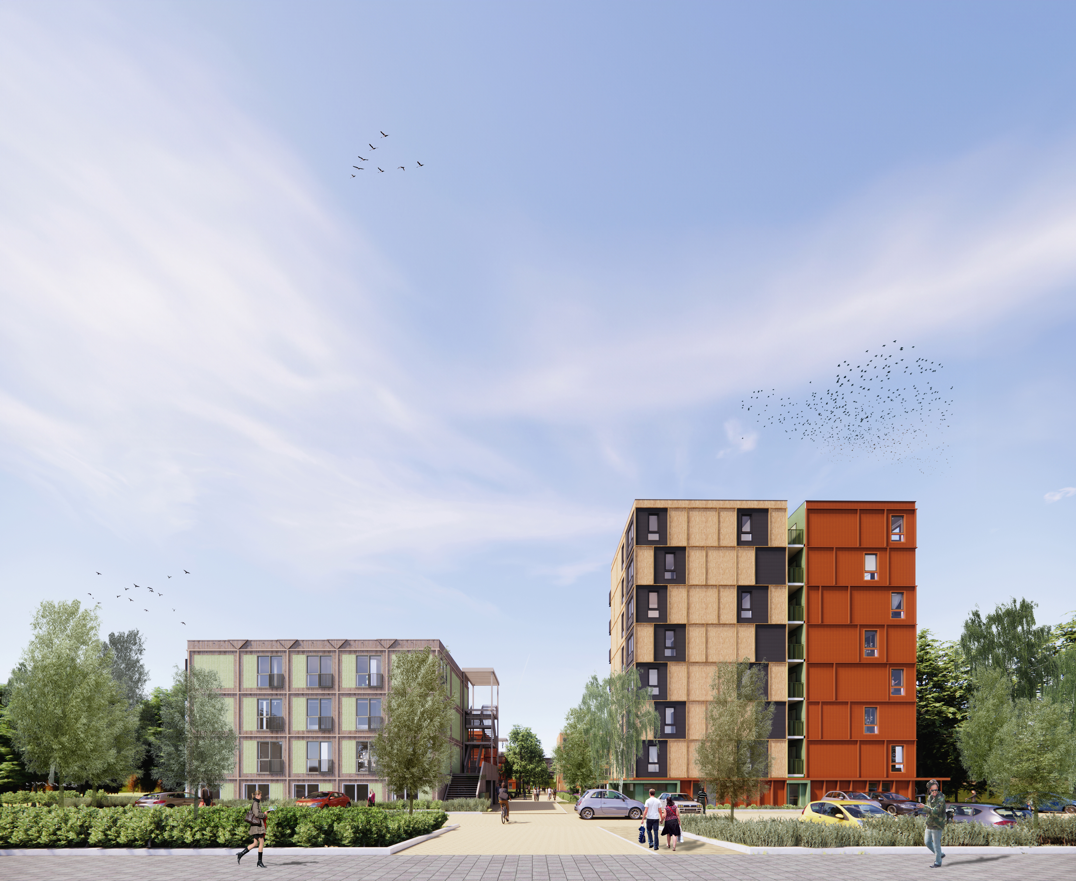 De woningen worden in de fabriek gebouwd en op het bouwterrein in- en op elkaar gezet. Dit noemen we modulair bouwen. Deze manier van bouwen gaat een stuk sneller dan de traditionele bouw en is ook duurzaam. Zo proberen we samen met de gemeente snel het grote tekort aan woonruimte in Amsterdam aan te pakken. De woningen blijven 15 jaar op deze locatie staan. Daarna kunnen ze verplaatst worden naar een andere plek.