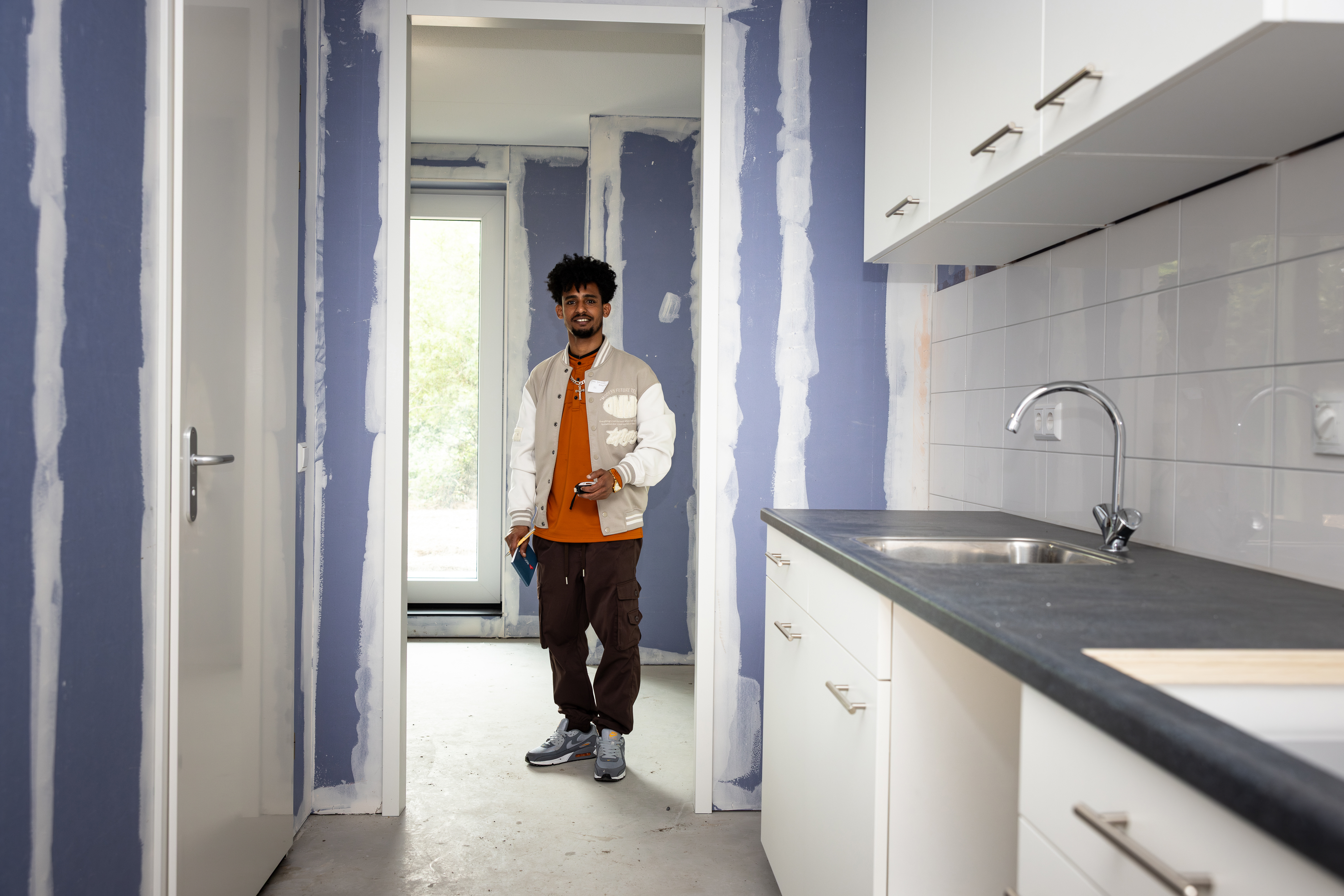 Yonas (29) komt uit Eritrea en woont nu nog in een azc. Hij houdt een zelfgetekende plattegrond van zijn woning vast. “Ik ben zo blij met mijn eigen plek. Straks ga ik vijf dagen per week naar school voor inburgering. Daarna wil ik werken als loodgieter.” Hij lacht: “Misschien kan ik hier alvast beginnen, want nog niet alle kranen doen het.”