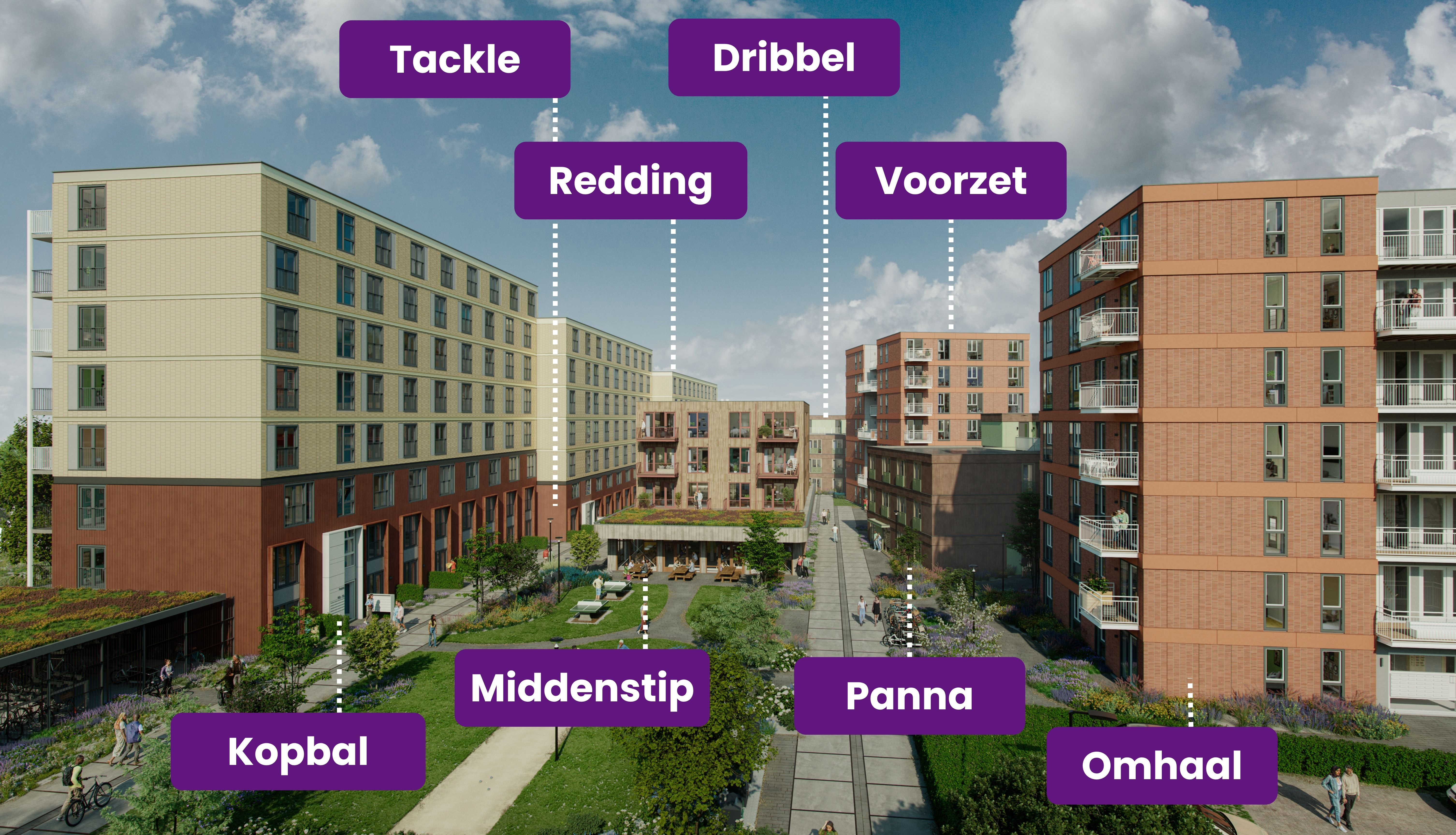 Gelegen naast de Johan Cruijff Arena en sportcomplex De Toekomst, komt deze nieuwe wijk op een plek met een unieke voetbalhistorie. Het voetbal-DNA is dan ook een gegeven. Daarom is ervoor gekozen om de acht nieuwe woongebouwen en buurtvoorziening namen te geven die geïnspireerd zijn op voetbalacties. Denk aan gebouwen als ‘De Omhaal’, ‘De Voorzet’ of ‘De Kopbal’ bijvoorbeeld en een centrale ontmoetingsplek met de naam ‘De Middenstip’. Een knipoog naar het verleden, met het oog op de toekomst.