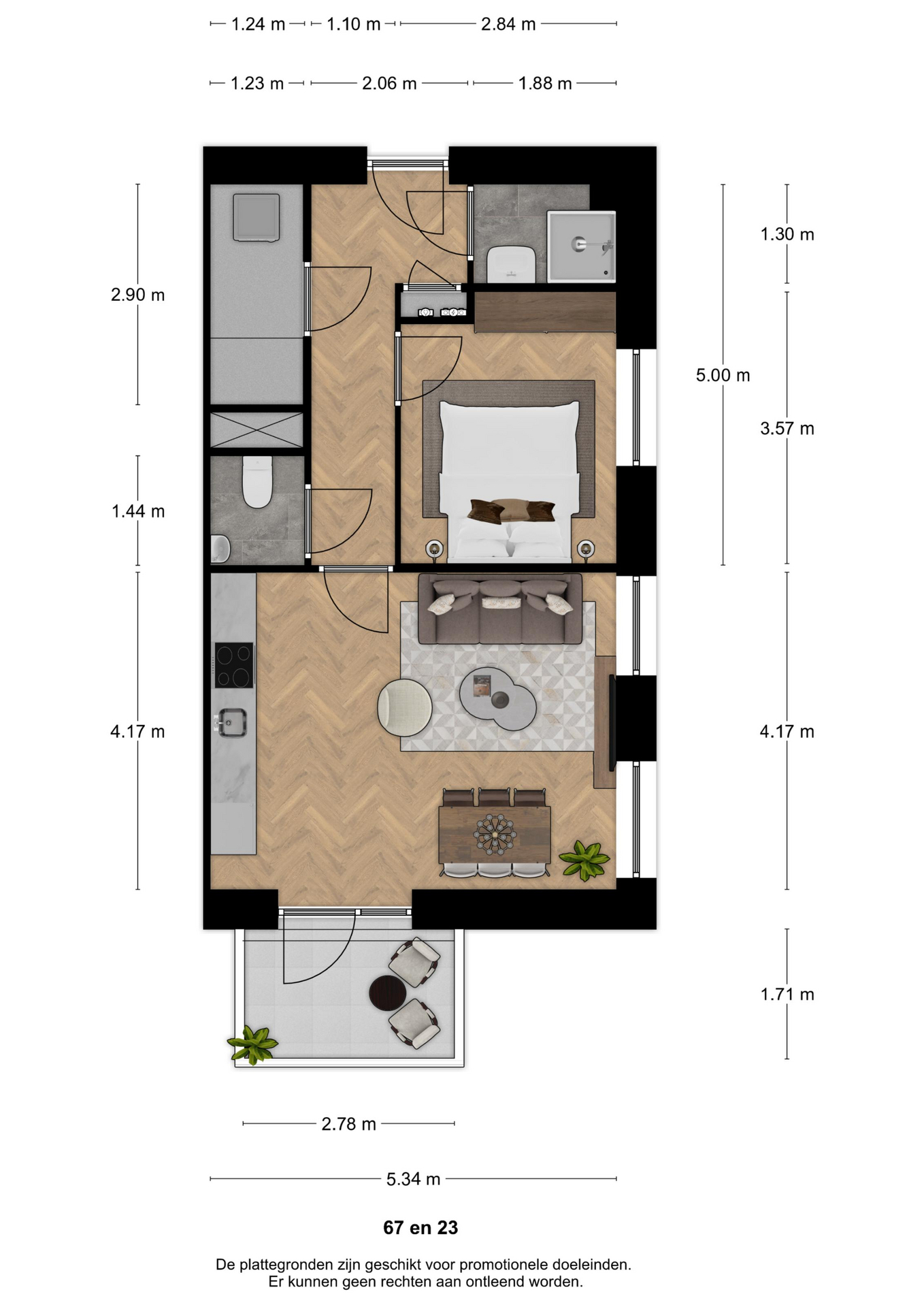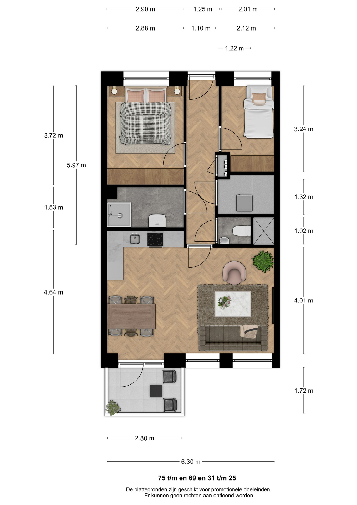 Deze plattegronden en informatie kunnen nog veranderen. U kunt hier geen rechten aan ontlenen. In deze plattegronden ziet een voorbeeld van hoe u de woning kunt inrichten. Wij verhuren de woningen leeg, dus zonder meubels.