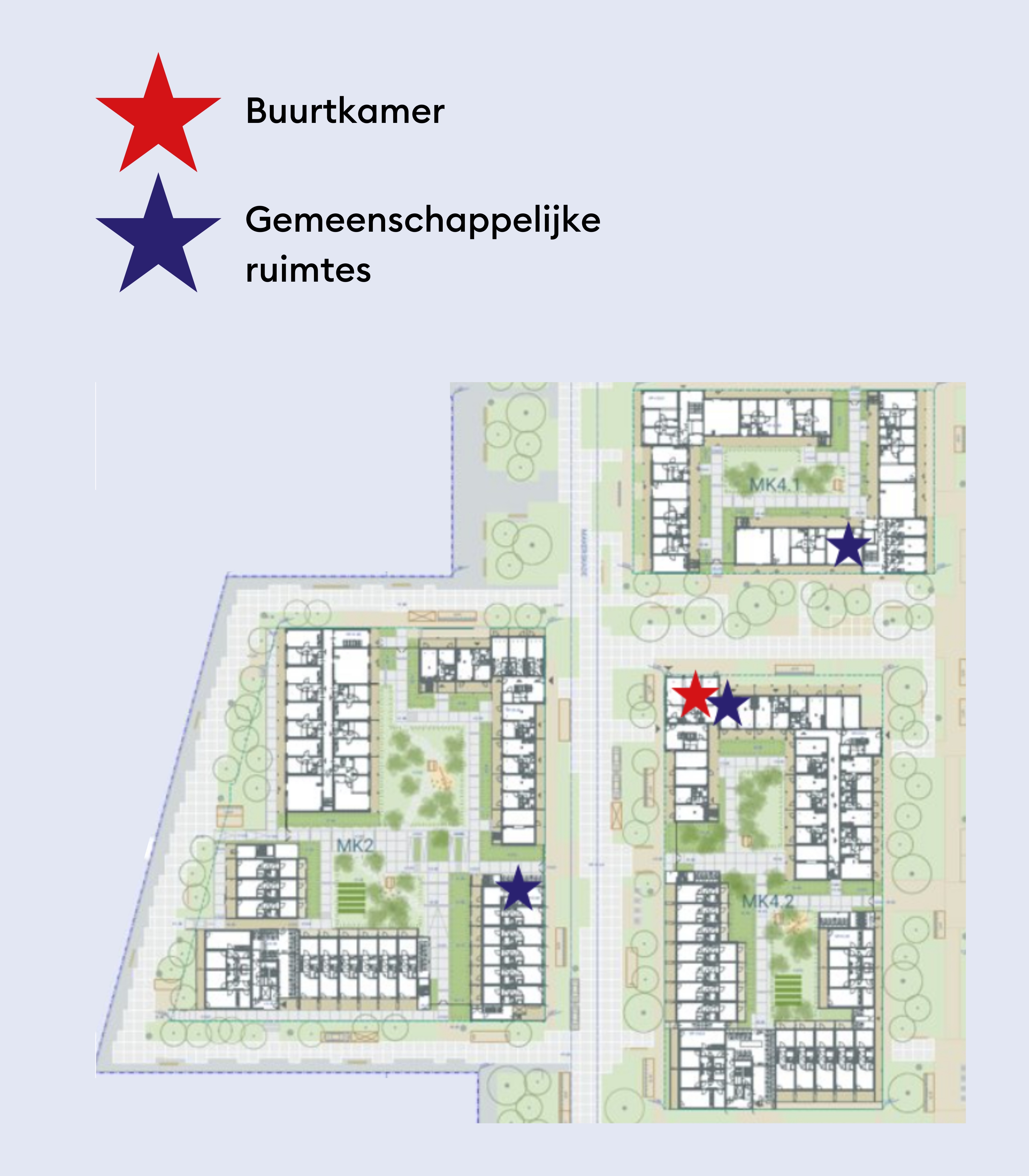 Naast de buurtkamer komen op meerdere plekken gezamenlijke ruimtes. Deze komen aan de binnentuin te liggen en wordt een plek waar bewoners elkaar kunnen ontmoeten en kleine activiteiten kunnen ondernemen voor en door bewoners