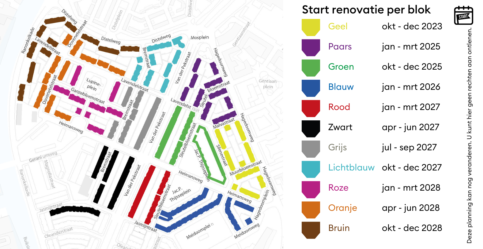 Het duurt ongeveer 12 jaar voordat alle woningen zijn gerenoveerd. Omdat het een groot gebied is met veel woningen, verdeelden we de wijk in gekleurde blokken van 100 tot 200 woningen. De volgorde van de overige blokken staat per kleur ingevuld op de afbeelding.